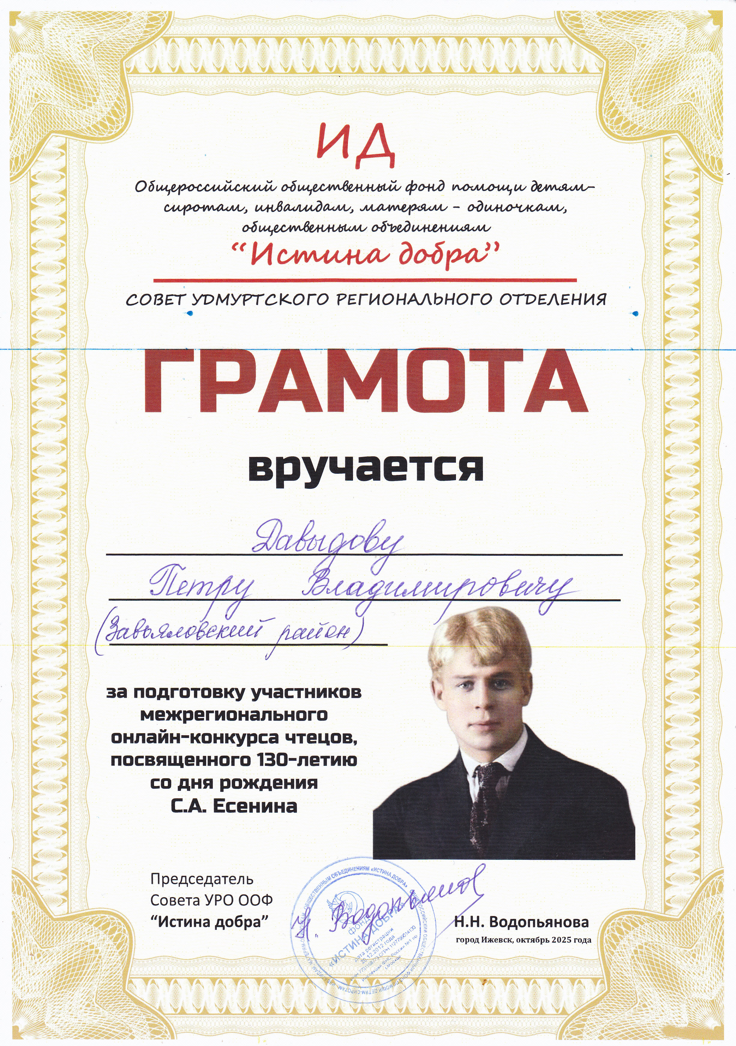 Грамота Давыдову Петру Владимировичу за подготовку участников межрегионального онлайн-конкурса чтецов, посвящённого 130-летию со дня рождения С. Есенина. Ижевск, 2025.
