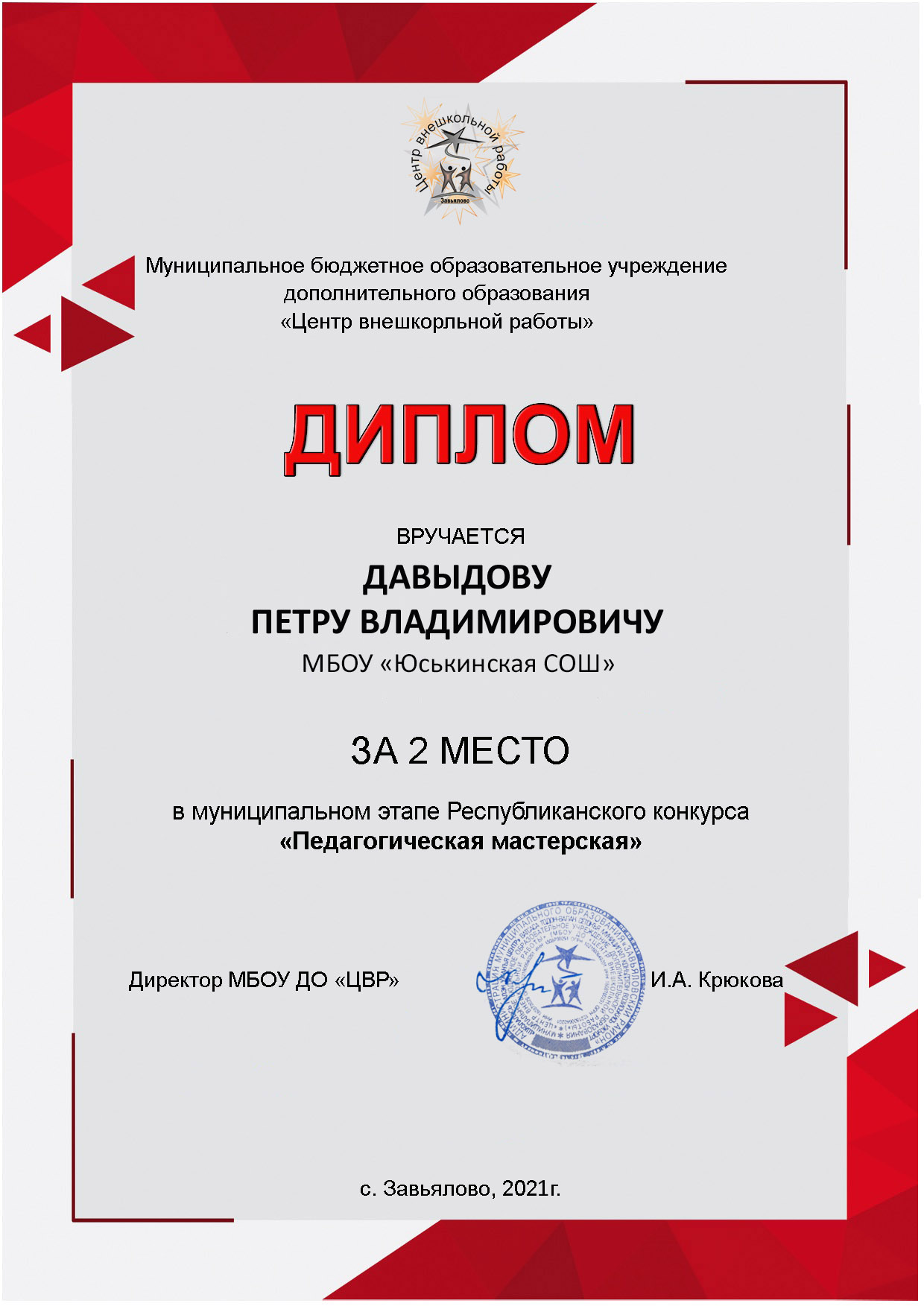 Диплом Давыдову Петру Владимировичу за 2 место в муниципальном этапе Республиканского конкурса "Педагогическая мастерская" (2021)