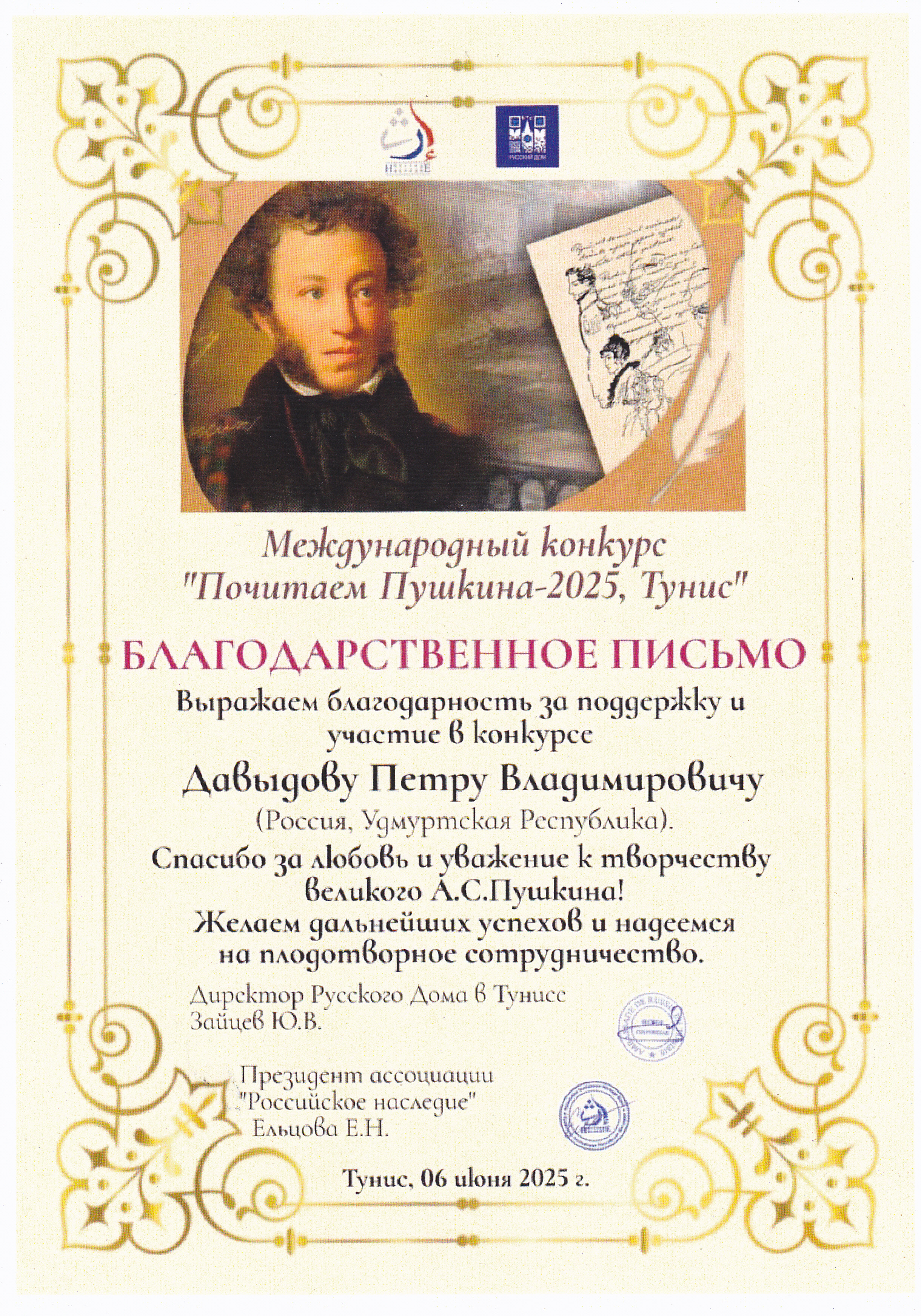 Благодарственное письмо Давыдову Петру Владимировичу за участие в Международном конкурсе "Почитаем Пушкина-2025, Тунис". 2025