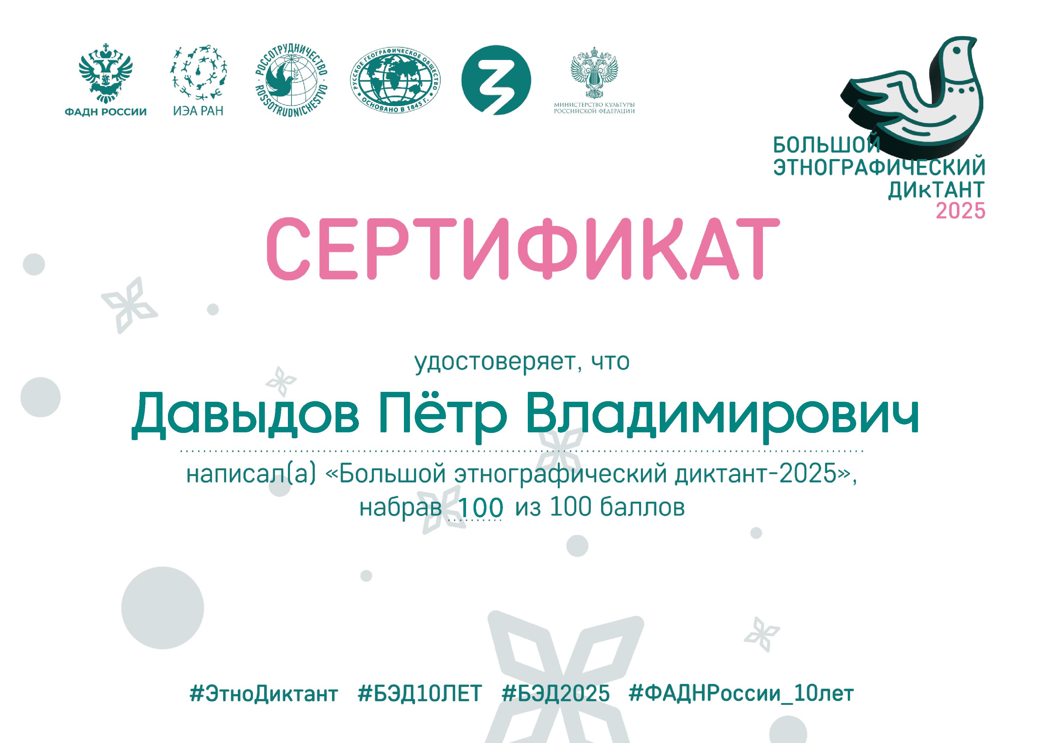 Сертификат удостоверяет, что Давыдов Пётр Владимирович написал Большой Этнографический Диктант - 2025, набрав 100 баллов из 100 баллов.