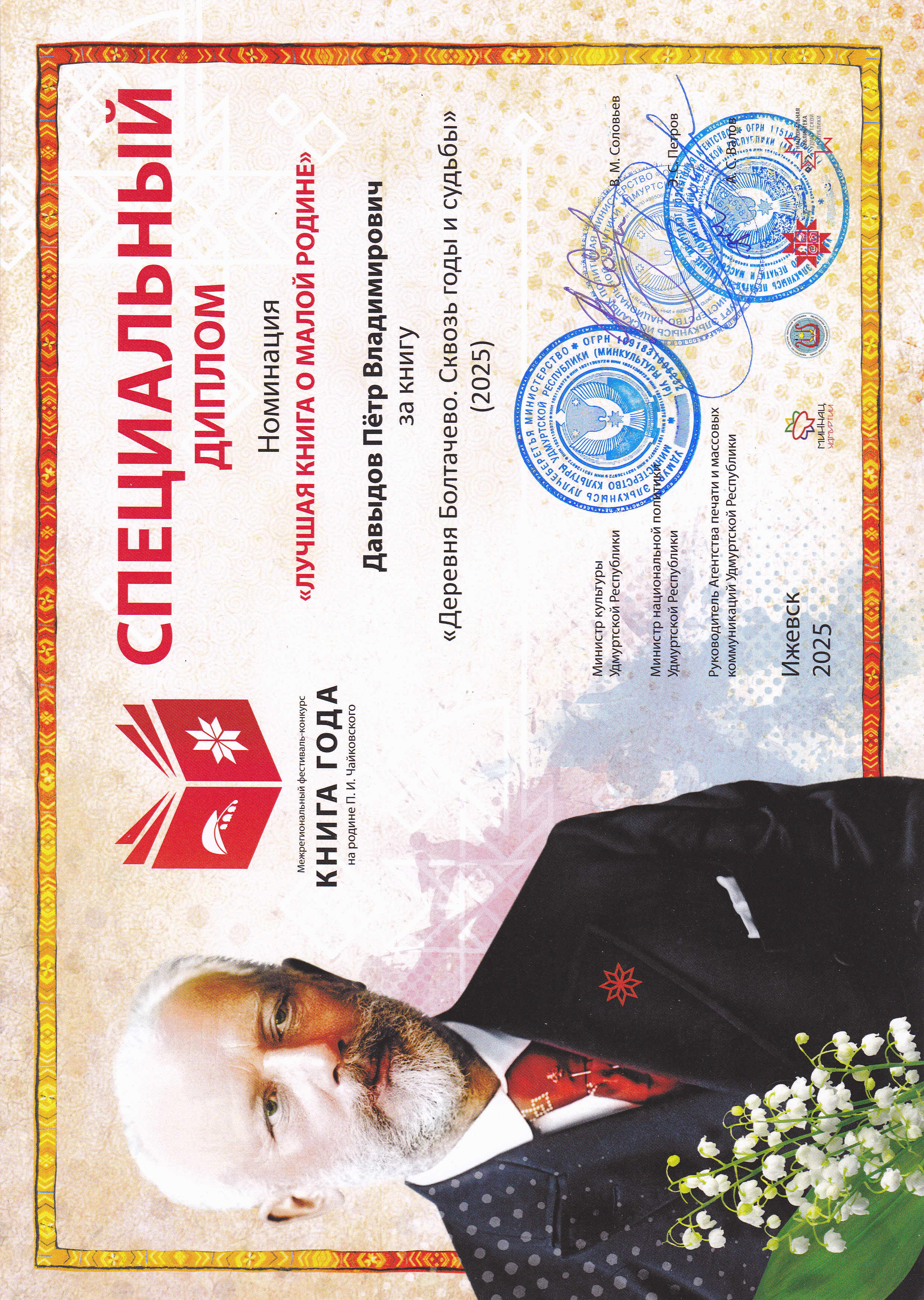 Специальный диплом Давыдову Петру Владимировичу Межрегионального фестиваля-конкурса "Книга года на родине П.И.Чайковского" за книгу "Деревня Болтачево. Сквозь годы и судьбы". Ижевск,2025.
