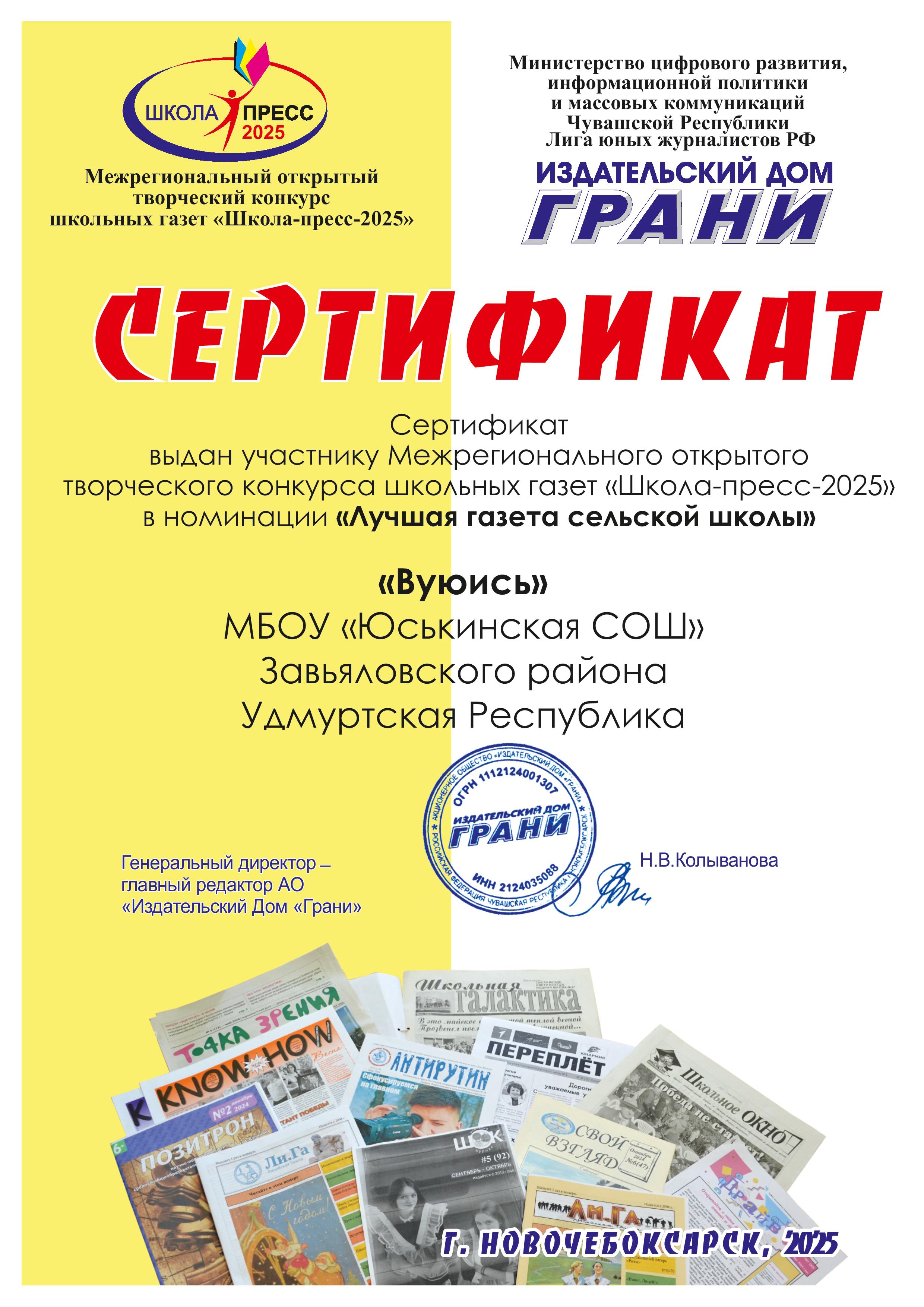 Сертификат выдан школьной газете "Вуюись" МБОУ "Юськинская СОШ" - участнику Межрегионального открытого творческого конкурса школьных газет "Школа-пресс-2023". г.Новочебоксарск