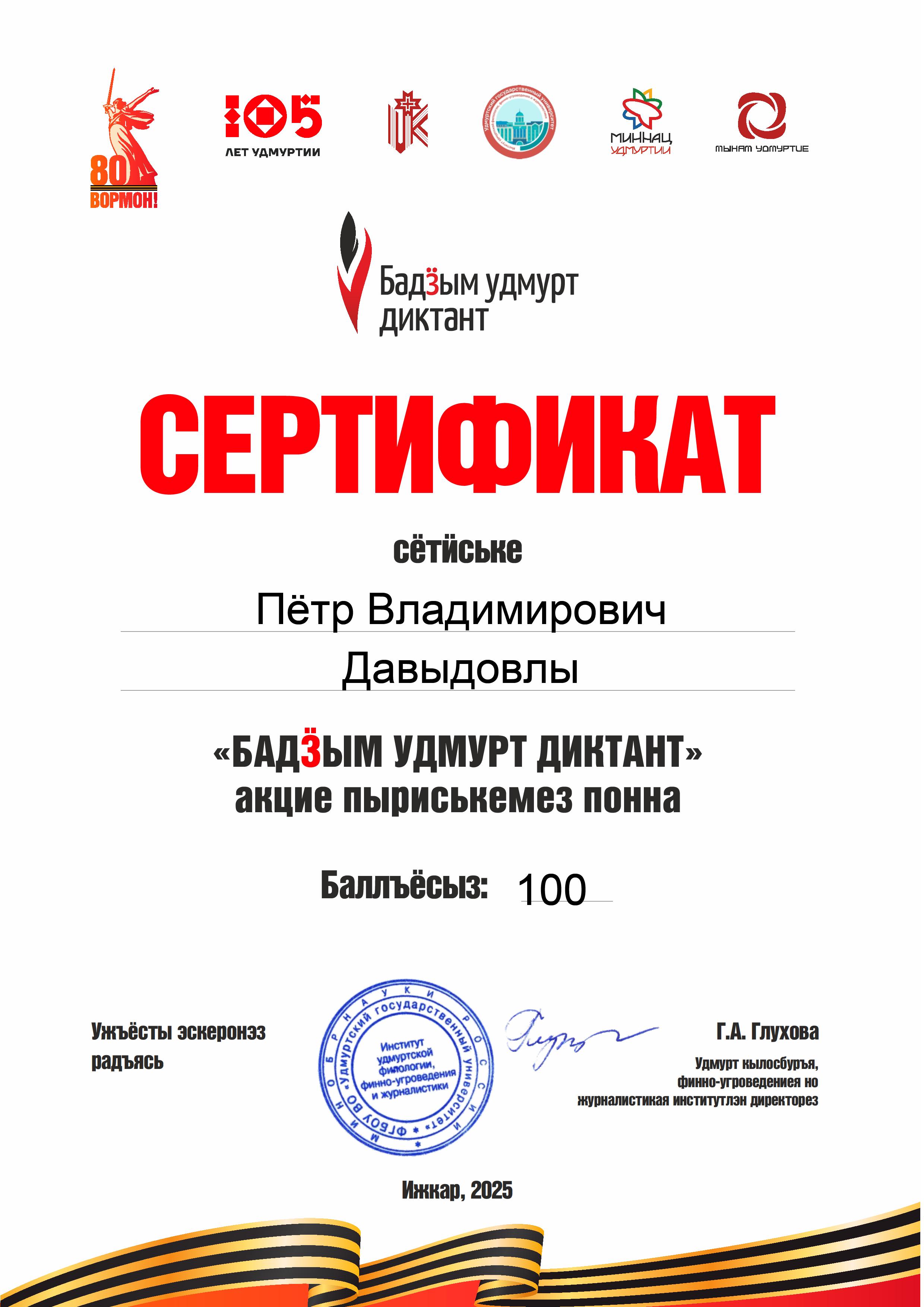 Сертификат Давыдову Петру Владимировичу за участие в акции "Большой удмуртский диктант". И.2025.