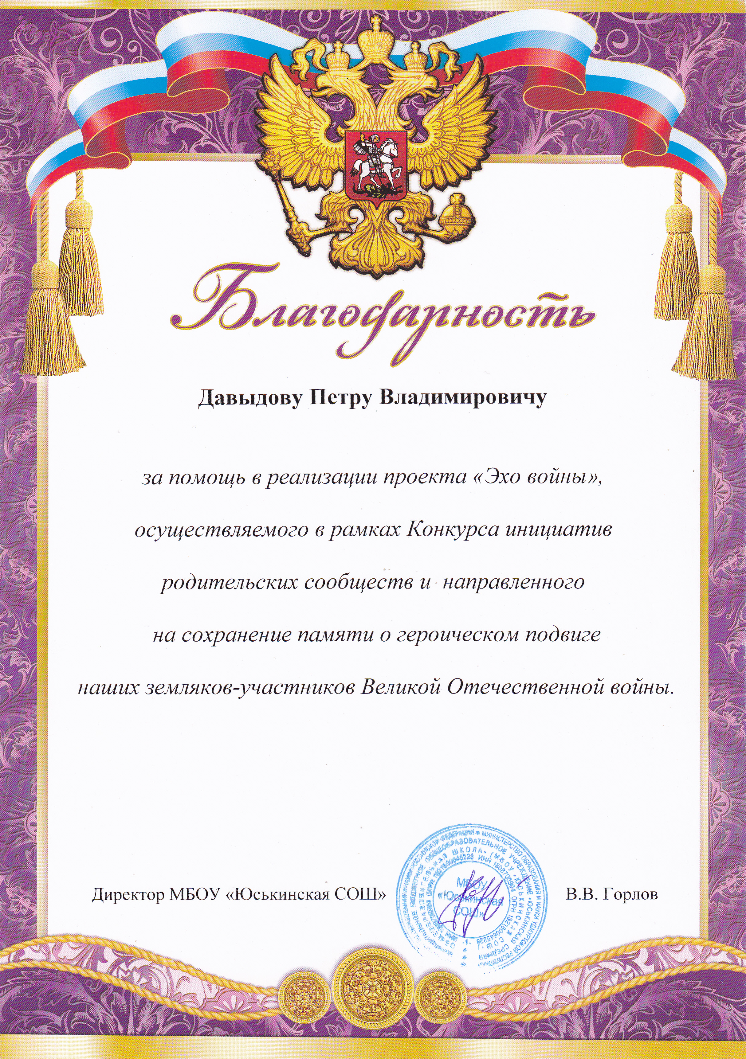 Благодарность Давыдову Петру Владимировичу за помощь в реализации проекта "Эхо войны", осуществляемого в рамках Конкурса инициатив родительских сообществ и направленного на сохранение памяти о героическом подвиге нашихземляков-участников ВОВ. 2025.