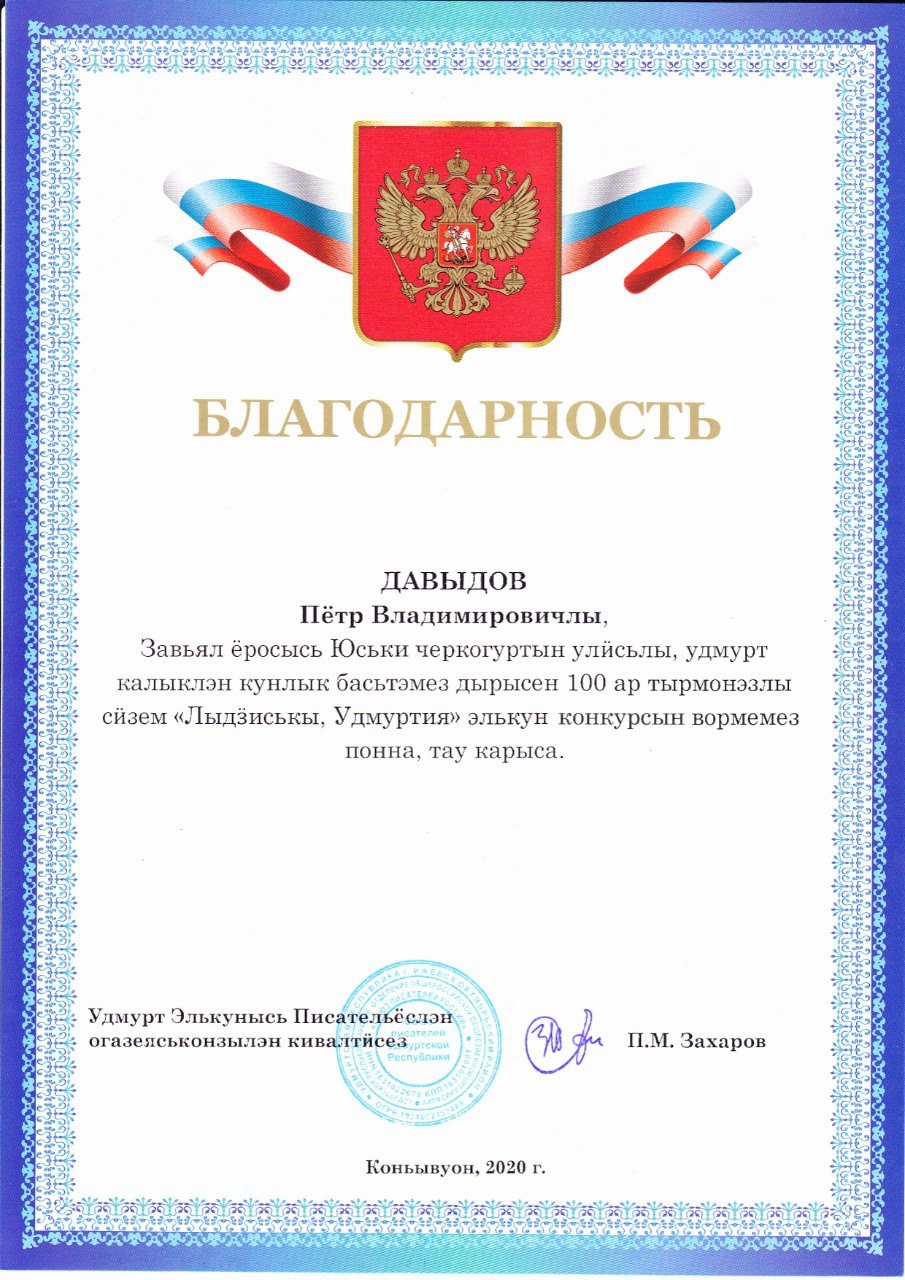 Благодарность Давыдову Петру Владимировичу - победителюреспубликанского конкурса "Лыдӟиськы,Удмуртия!" к 100-летиюгосударственности УР. (Ижевск, 2020).