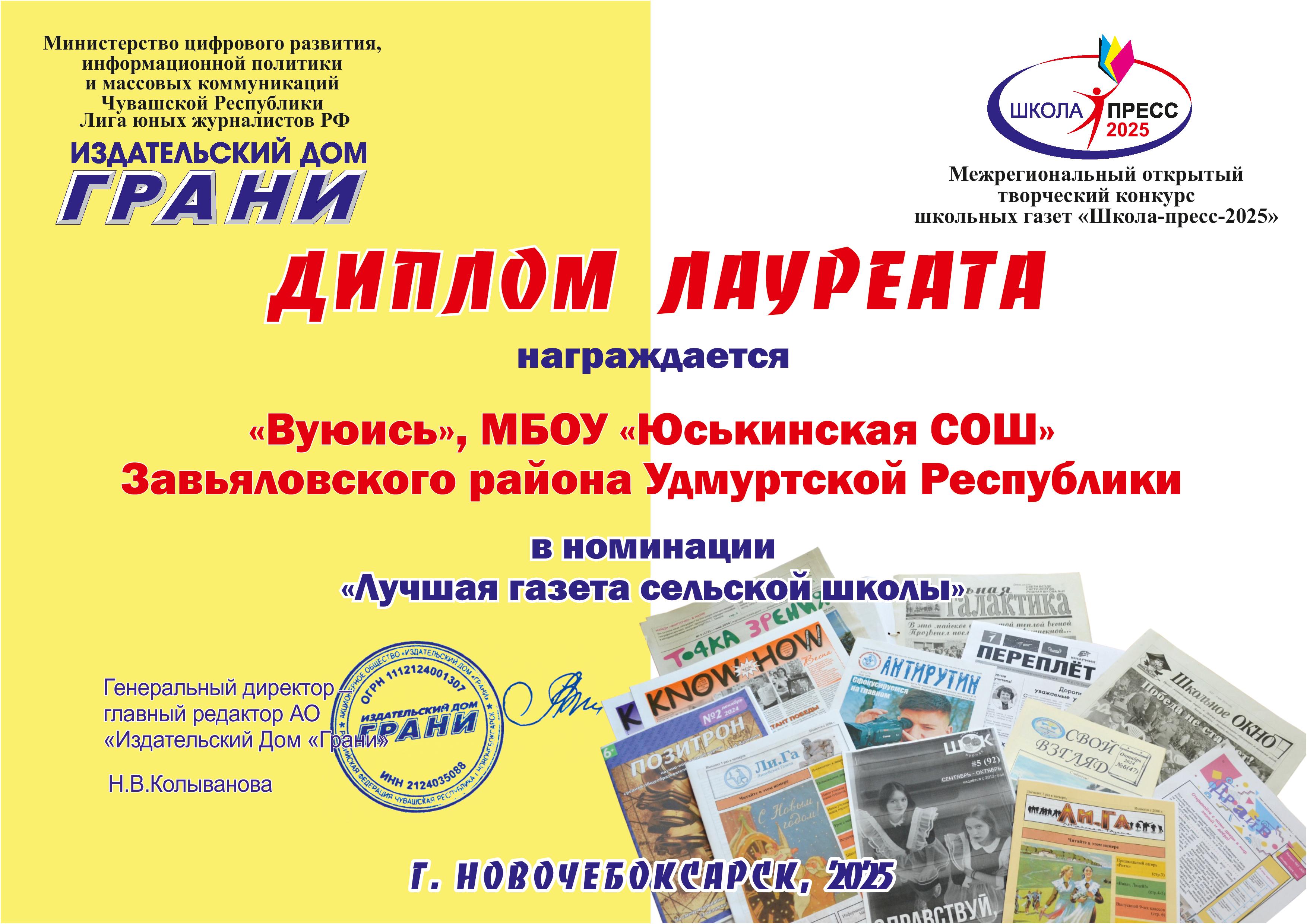 Диплом лауреата награждается газета "Вуюись" в номинации "Лучшая газета сельской школы". Новочебоксарск,2025.