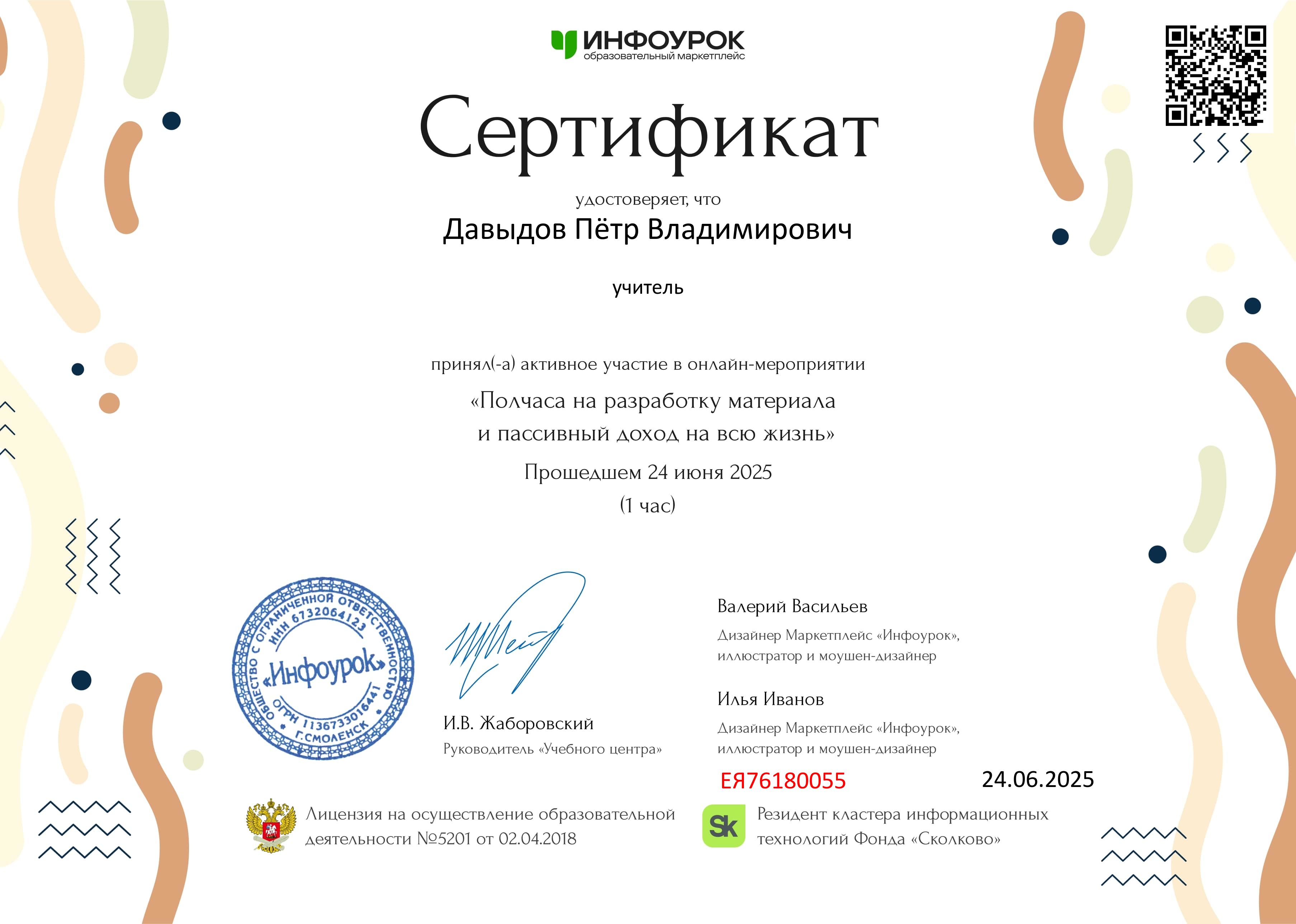 Сертификат удостоверяет, что Давыдов Пётр Владимирович принял активное участие в онлайн-мероприятии "Полчаса на разработку материала и пассивный доход на всю жизнь". Инфоурок. 2025.