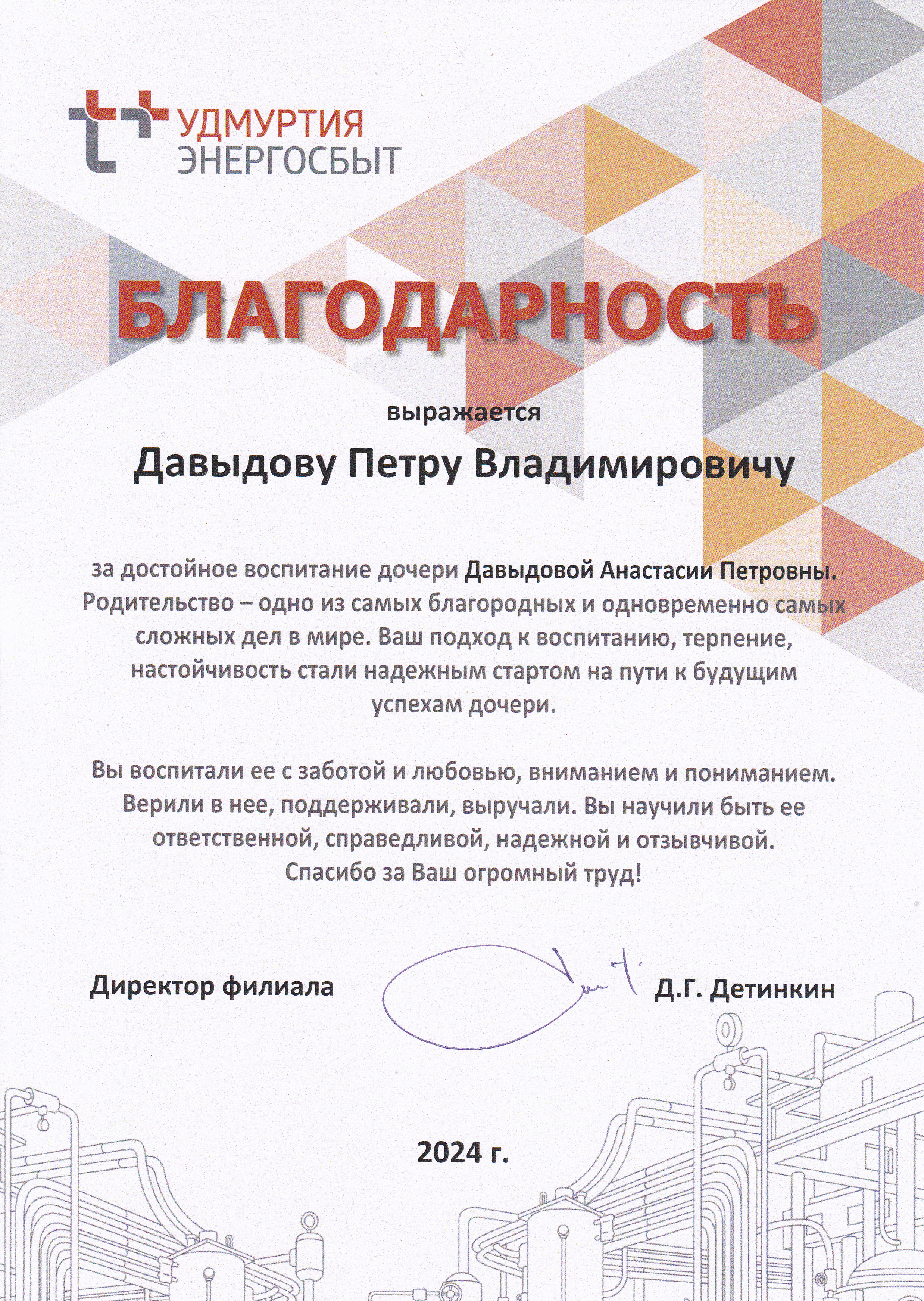 Благодарность Давыдову Петру Владимировичу за достойное воспитание дочери. Ижевск,2024.