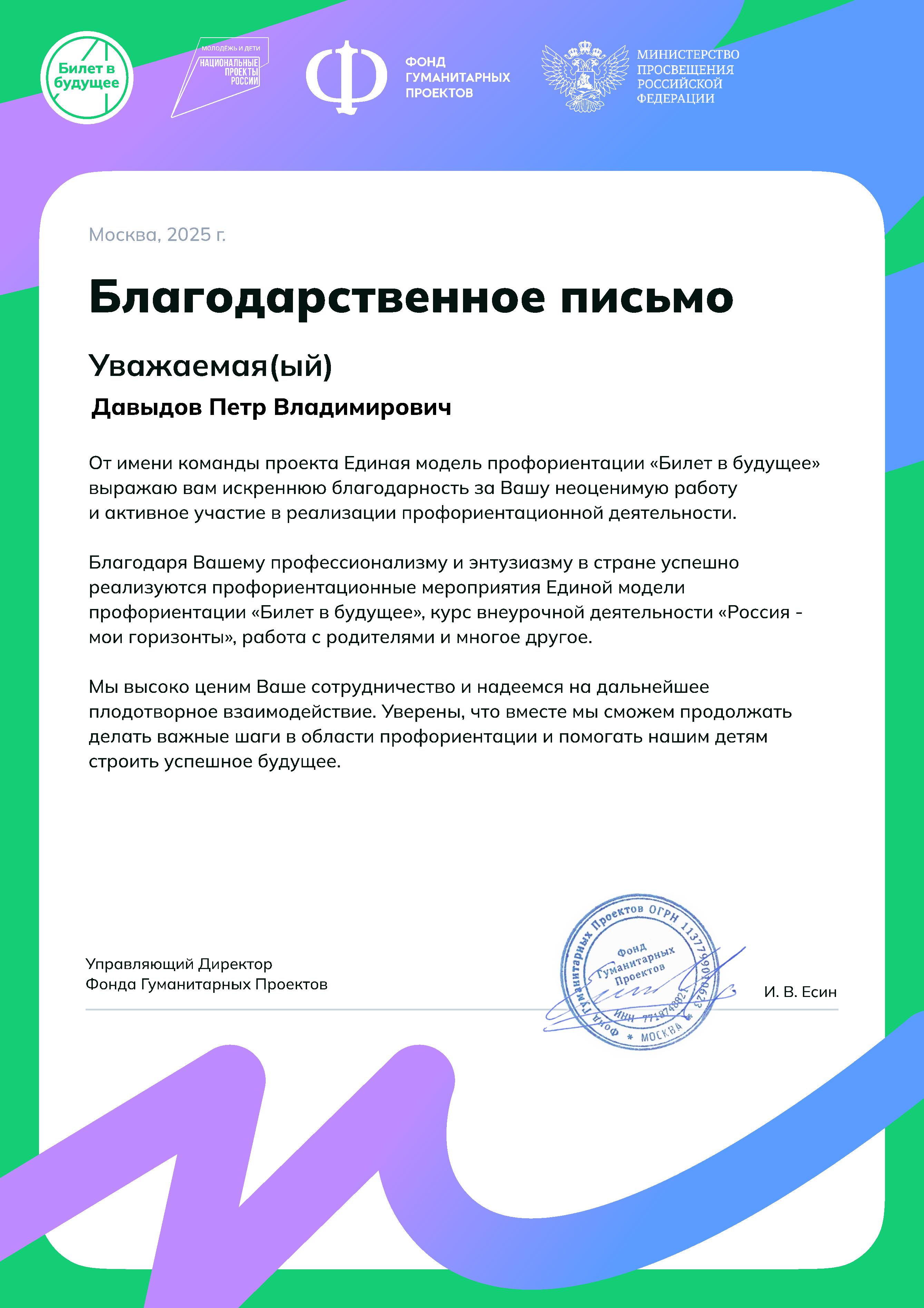 Благодарственное письмо Давыдову Петру Владимировичу за активное участие в реализации профориентационной деятельности. Москва, 2025.